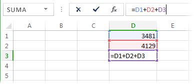 La fórmula =D1+D2+D3 es errónea porque reside en la celda D3 y está intentando calcularse a sí misma.